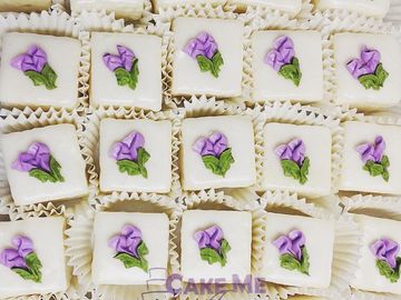 Coconut cake filled with coconut cream and chocolate ganache Petit Fours Petit fours are sold by the dozen and half dozen with a 2 dozen minimum order. Come by our Dallas NC.